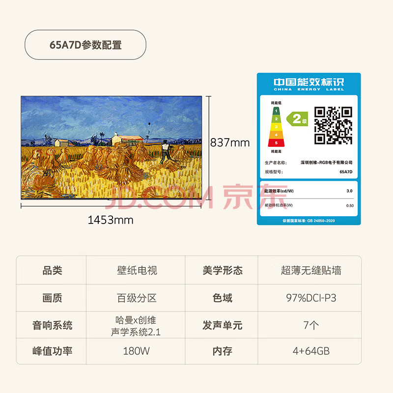 商品相册:创维壁纸电视65A7D 65英寸超薄壁画艺术电视机 无缝贴墙百变艺术屏 240Hz高刷 家电液晶电视 第