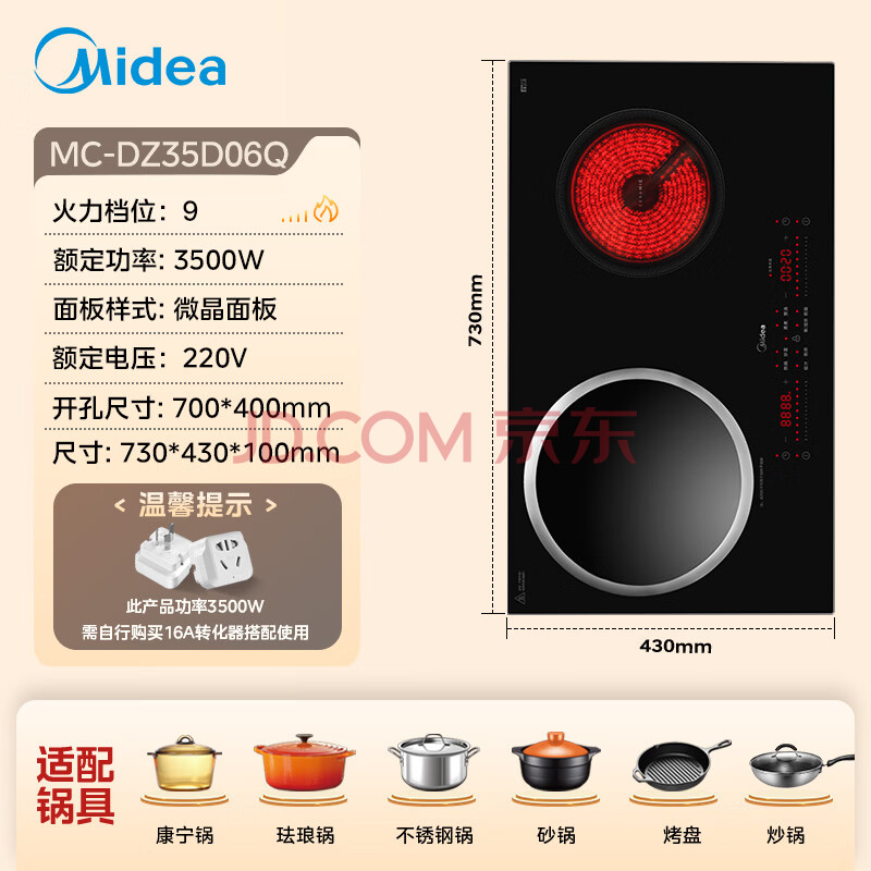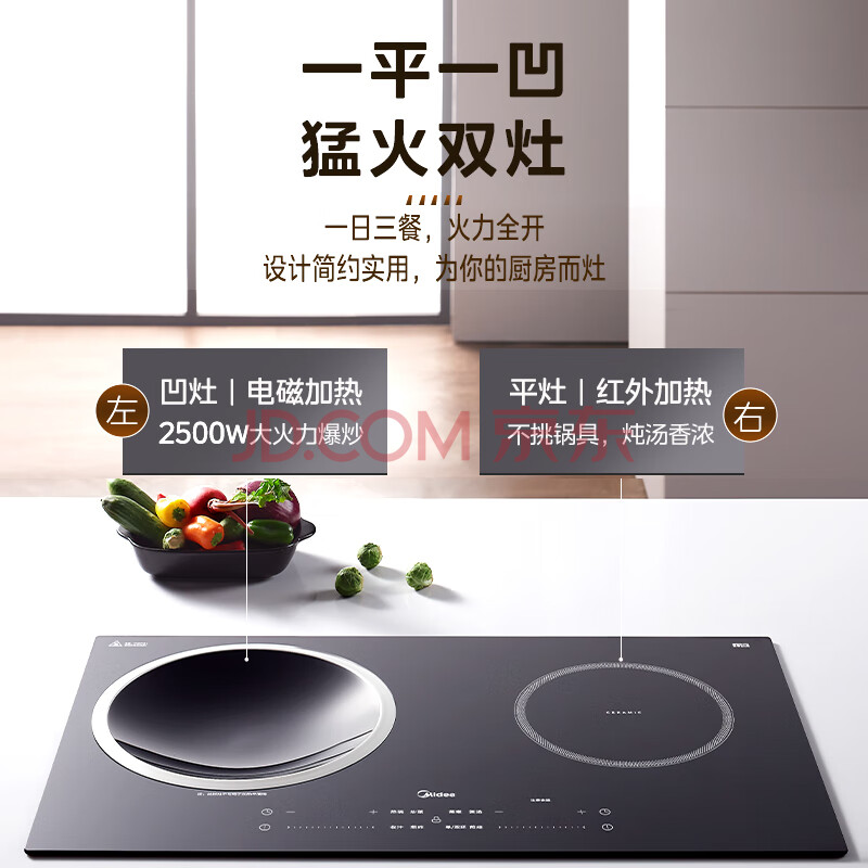 商品相册:美的(Midea)凹面电磁炉嵌入式电磁双灶电陶炉 家用3500W大功率电池炉炒菜定时烹饪灶台一体面板DZ35D06Q第
