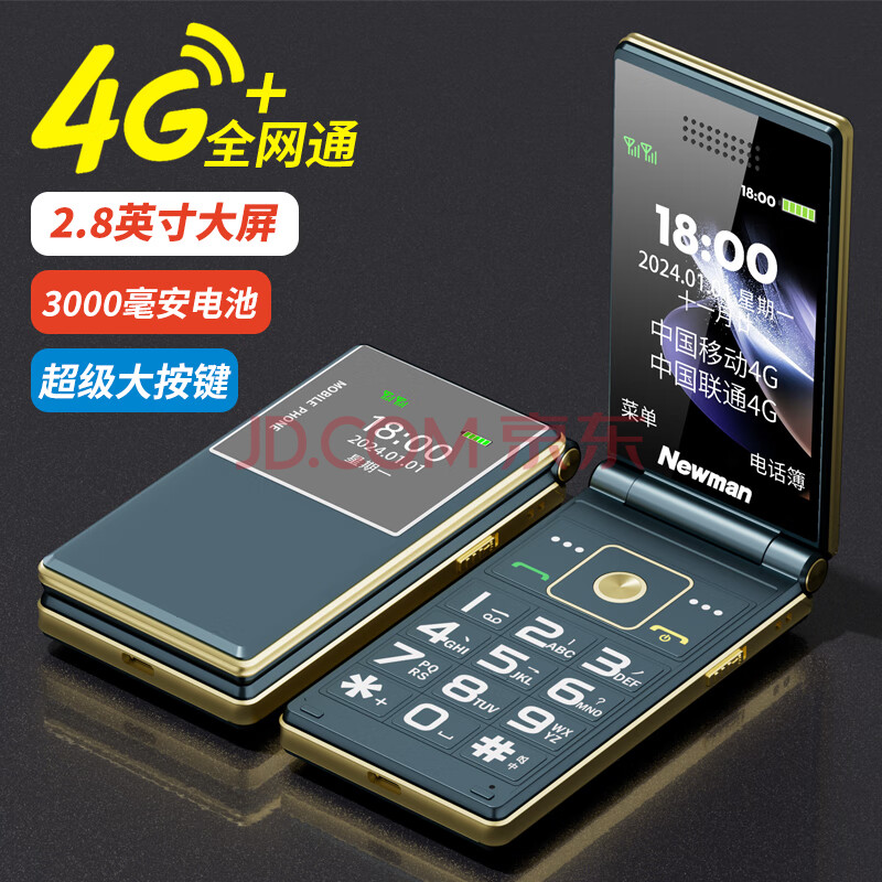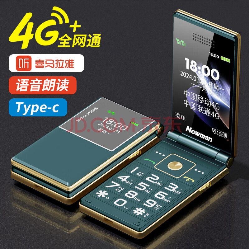 商品相册:纽曼(Newman) V09 祖母绿 4G全网通翻盖老年人手机 超长待机老年机 大字大声音大按键老人手机 学生备用功能机第