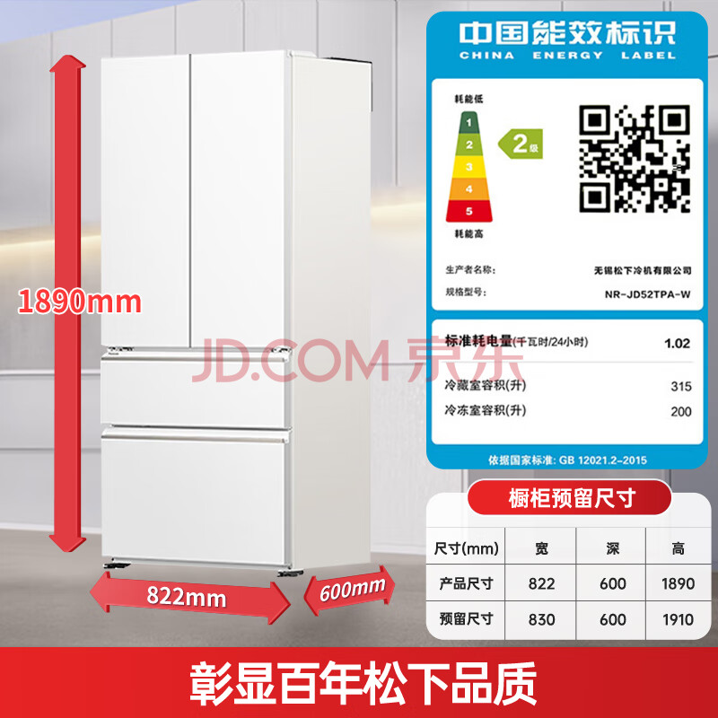 商品相册:松下(Panasonic)大海豹515升法式多门冰箱家用零嵌入式电冰箱自动制冰净味抗菌风冷无霜NR-JD52TPA-W第