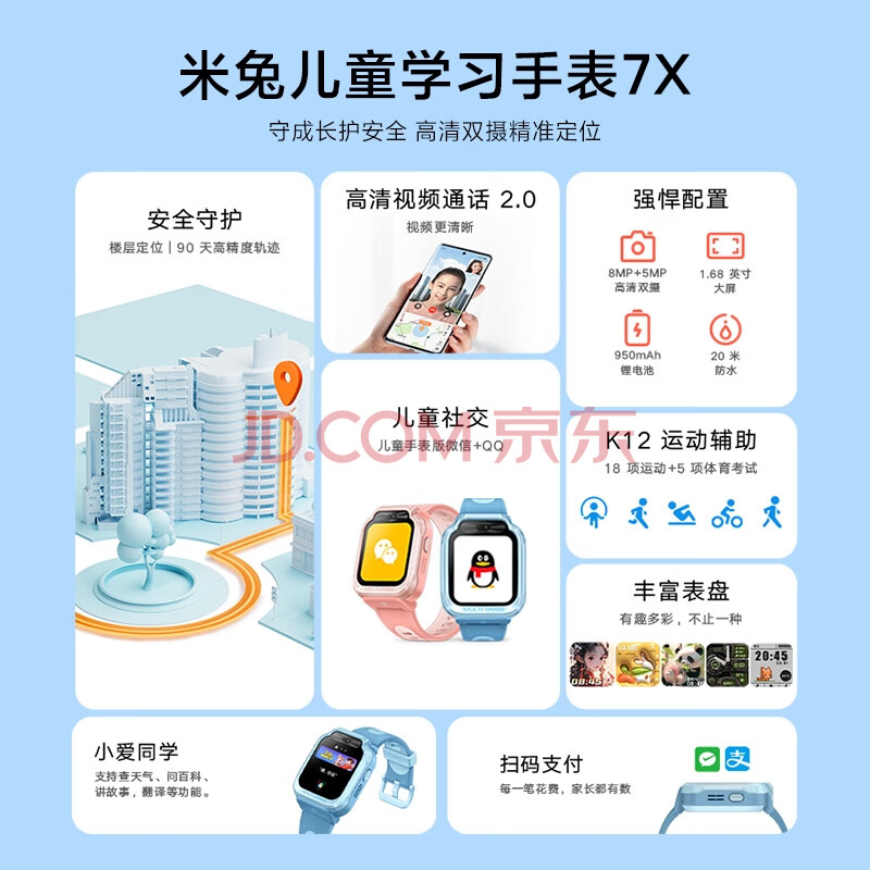 商品相册:小米(MI)米兔儿童电话手表7X 蓝色高清双摄大屏楼层定位防水微信小学生初高中生男女智能运动手表第