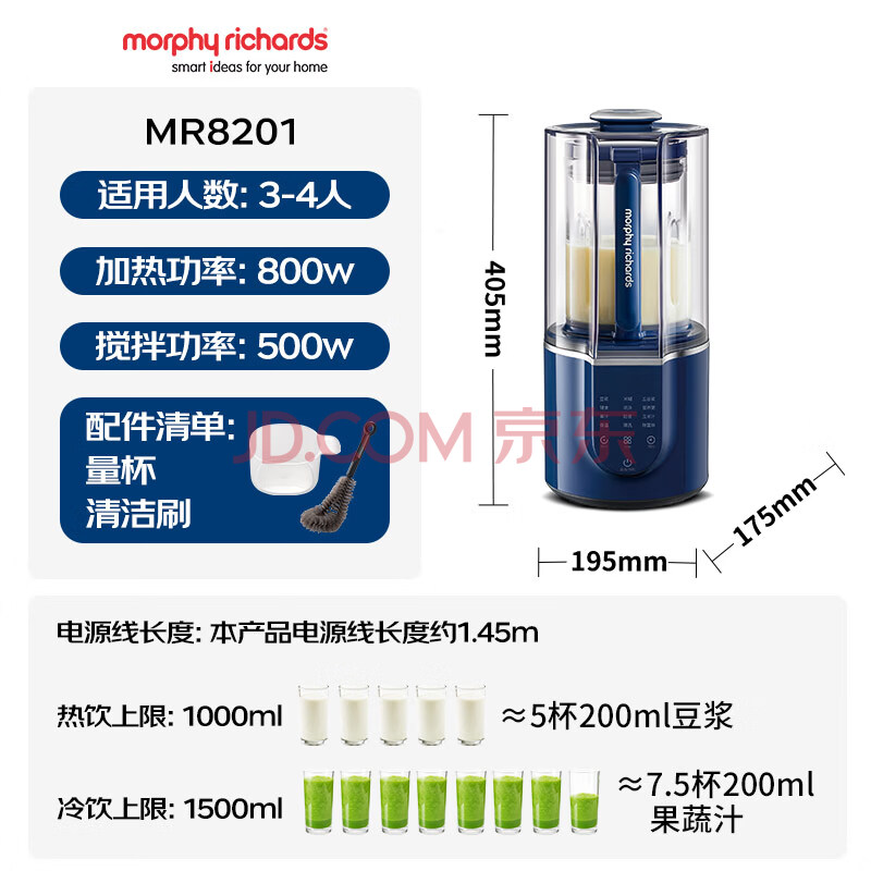 商品相册:摩飞电器(Morphyrichards)破壁机 家用1.5L多功能柔音豆浆机女神节送礼加热全自动榨汁机 3-4人预约隔音降噪辅食机MR8201蓝第
