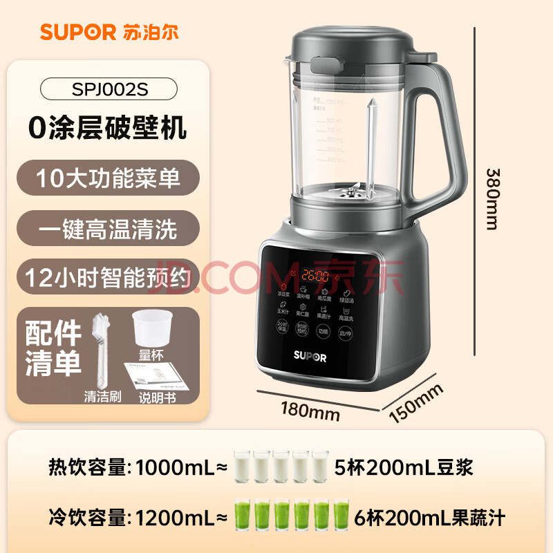 商品相册:苏泊尔(SUPOR)降噪破壁机 家用1.2L小型多功能辅食料理机 可预约轻音免滤豆浆机 3-4人破冰碎冰榨汁机 SPJ002S第
