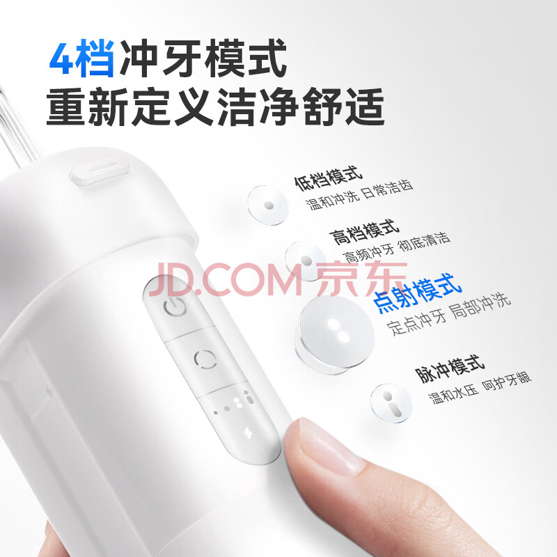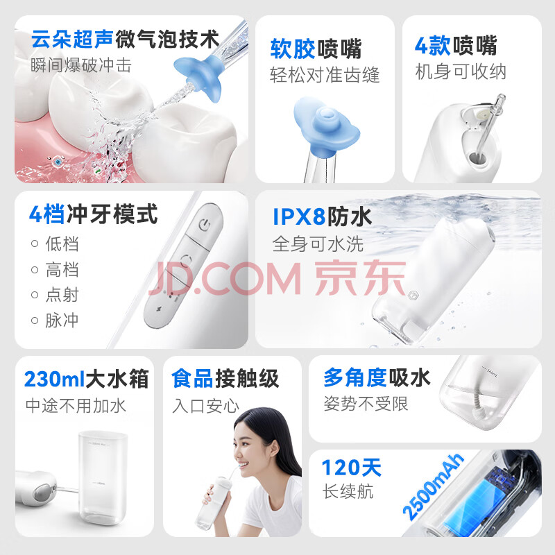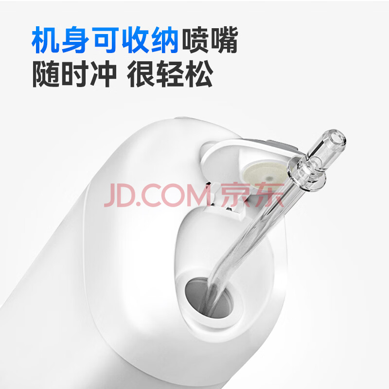 商品相册:京东京造专业抽拉冲牙器便携式白 4喷嘴收纳盒洗牙器水牙线洁牙器牙齿冲洗器预防牙结石生日礼物送男女朋友第