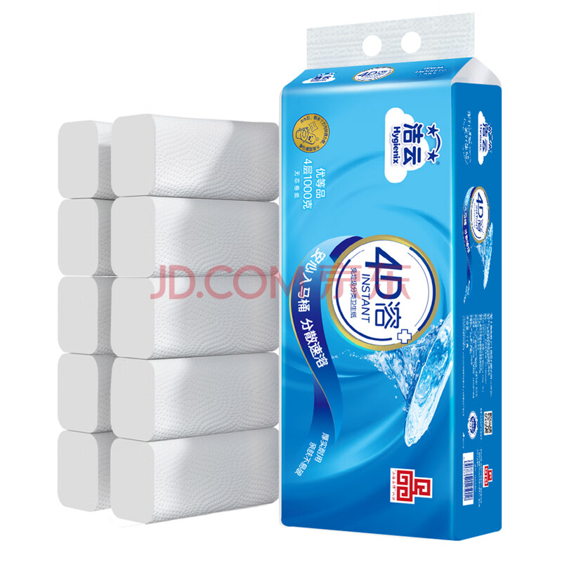 商品相册:洁云卫生纸 4层加厚无芯卷纸100克*10卷 4D溶+速溶厕纸巾家庭装可冲散第