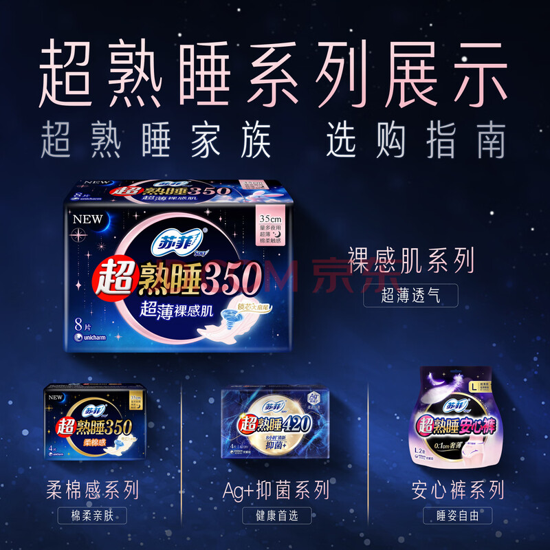 商品相册:苏菲超熟睡超薄裸感肌夜用卫生巾35cm8片超长扇尾量多姨妈巾自营官方第
