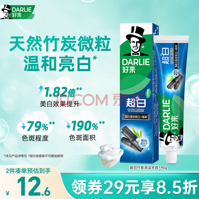 商品相册:好来(DARLIE)(原黑人)超白竹炭深洁牙膏温和清新去牙渍亮白含氟190g新旧包装第