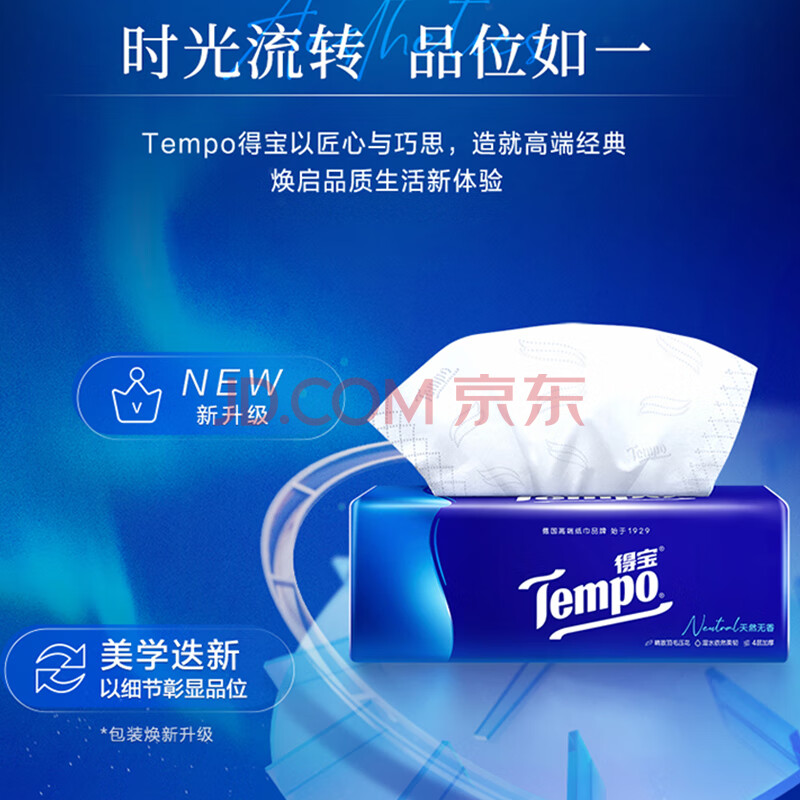 商品相册:得宝(TEMPO)一博同款 抽纸 真M码 无香4层90抽*18包 湿水不易破 纸巾餐巾纸第