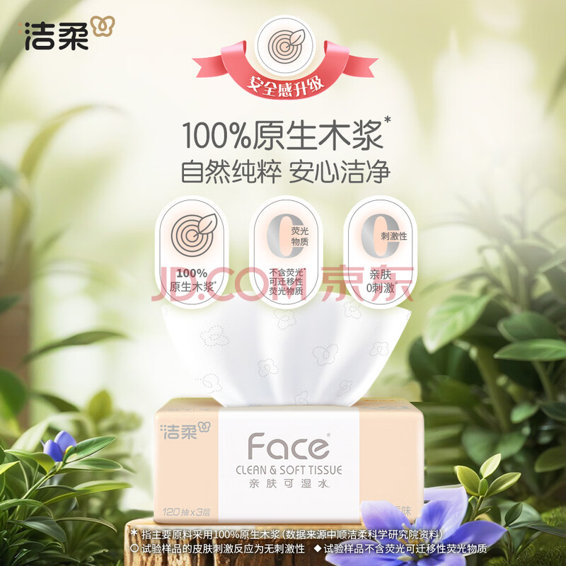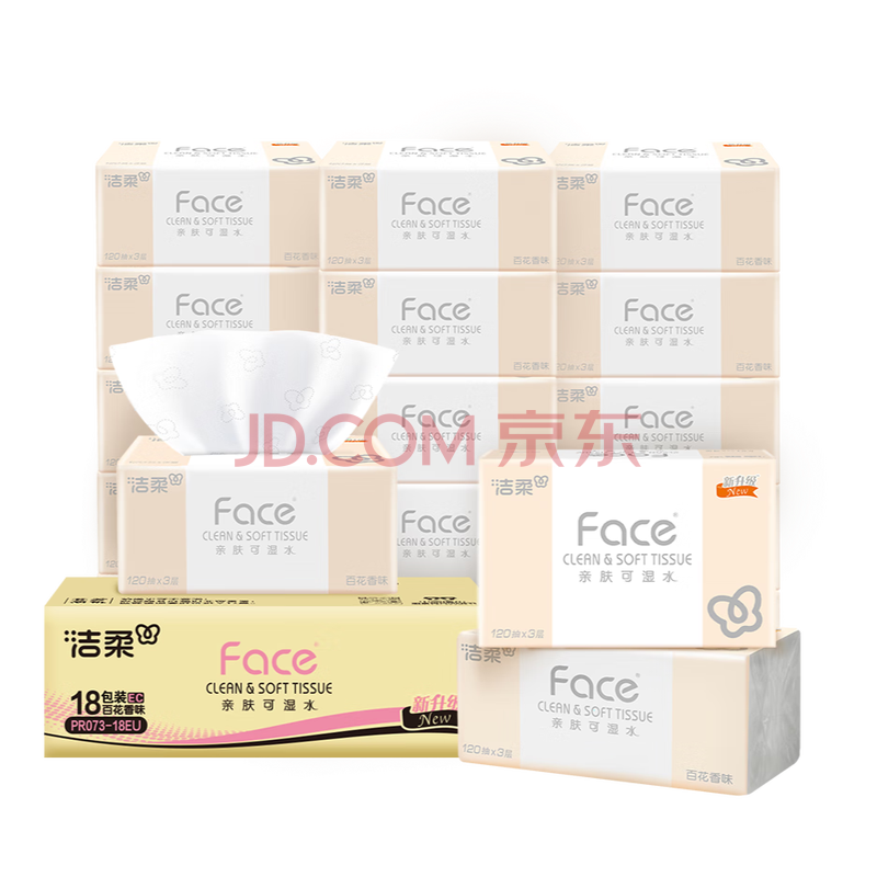 商品相册:洁柔抽纸 粉Face柔韧3层120抽*18包 面巾纸 百花香芬 整箱卫生纸纸巾第