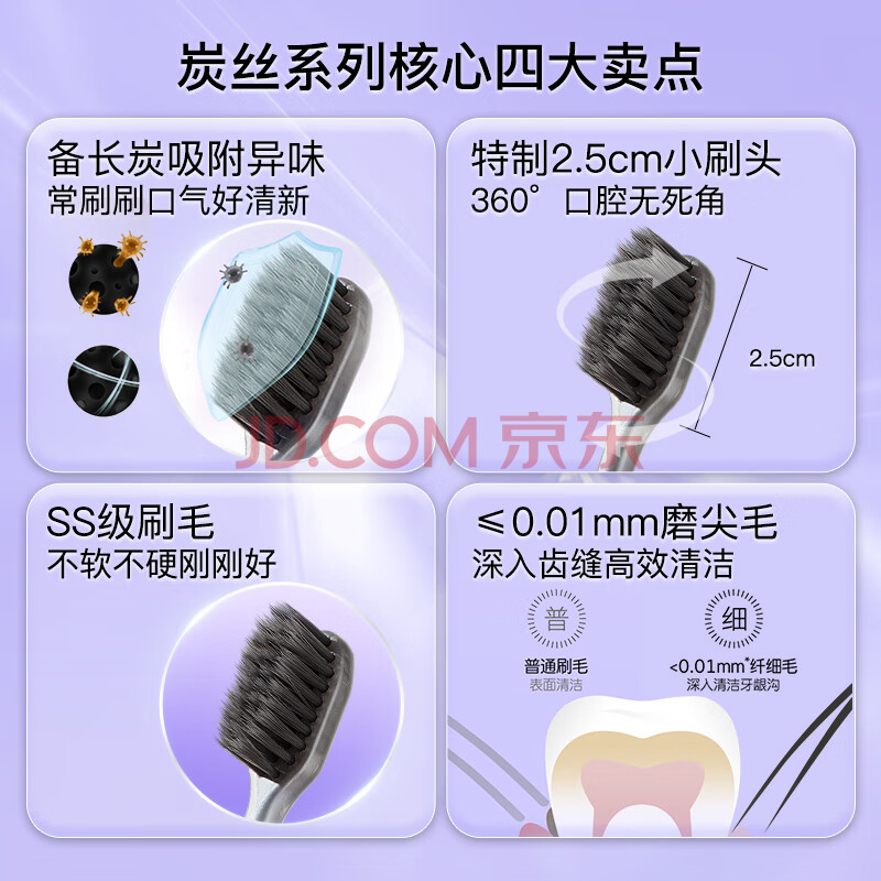 商品相册:舒客备长炭软毛牙刷2支装去异味清新口气炭丝吸附成人小刷头新老随机第1张/共7