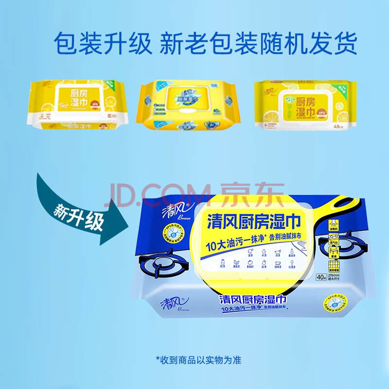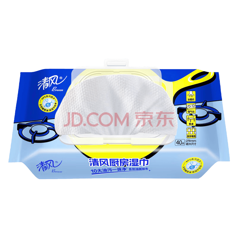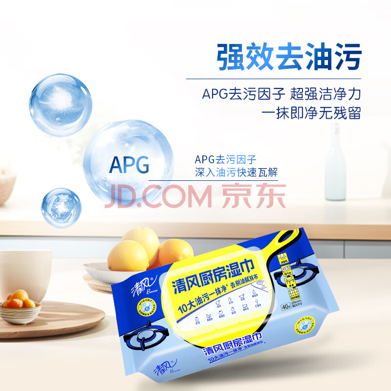 商品相册:清风厨房湿巾40片*单包 超大加厚次抛清洁巾免洗涤擦吸油烟机强效去污第
