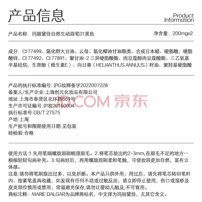 商品相册:玛丽黛佳(MARIE DALGAR)自然生动眉笔持久新手适用不易脱色扁头01黑色第
