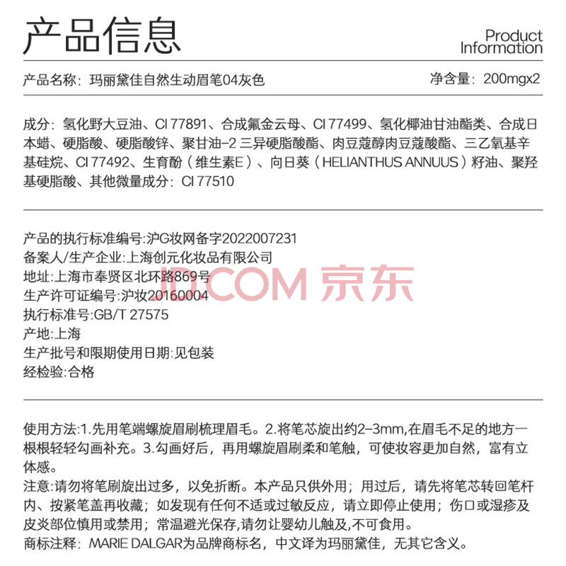 商品相册:玛丽黛佳(MARIE DALGAR)自然生动眉笔持久新手适用不易脱色扁头04灰色0.2g*2第