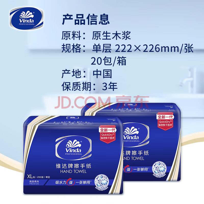 商品相册:维达擦手纸单层200抽*20包XL码加大 卫生间酒店商用抽纸巾整箱VS2056第