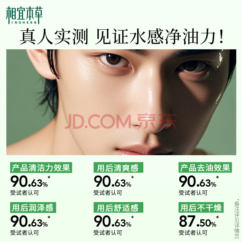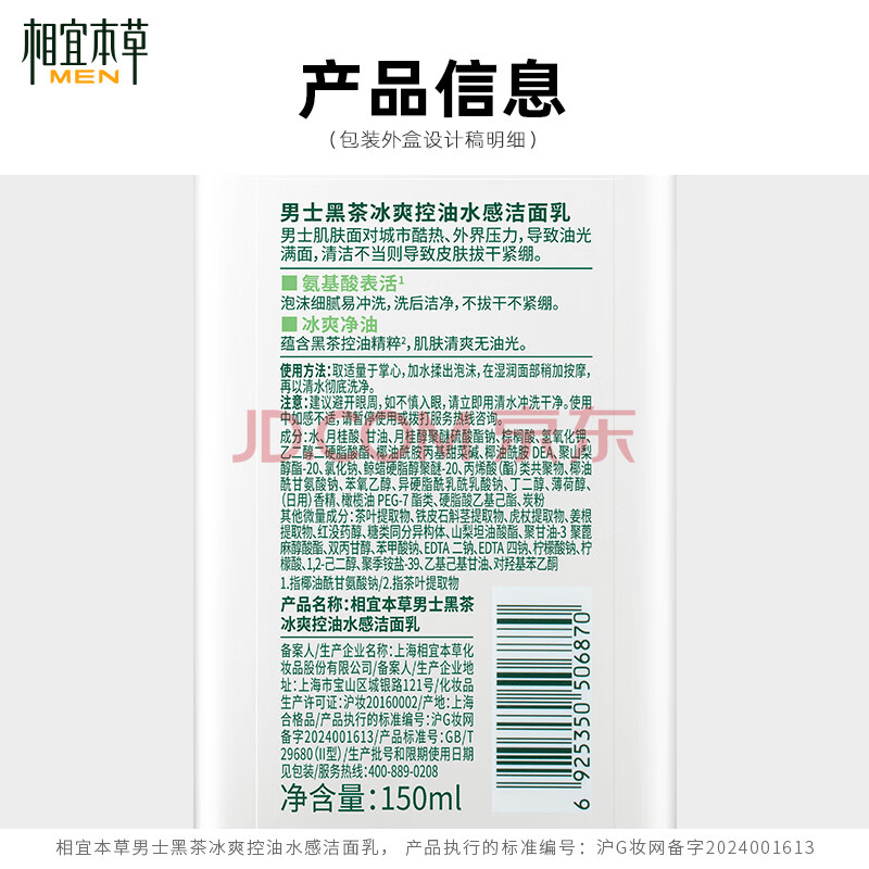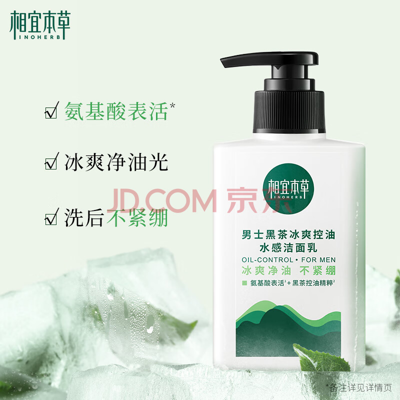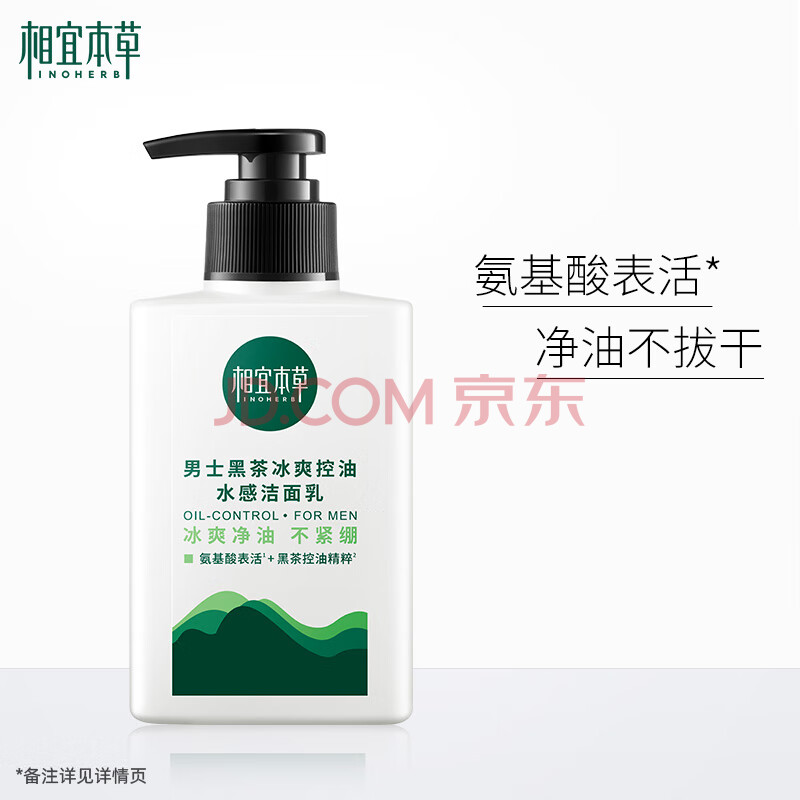 商品相册:相宜本草 男士黑茶冰爽控油水感洁面乳150ml 氨基酸洗面奶去油不紧绷第