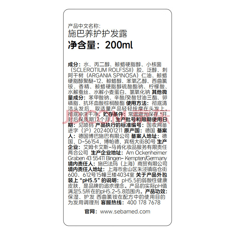 商品相册:施巴(Sebamed)修护护发素润发乳滋润发膜柔顺修复烫染损伤200ml德国原装进口第