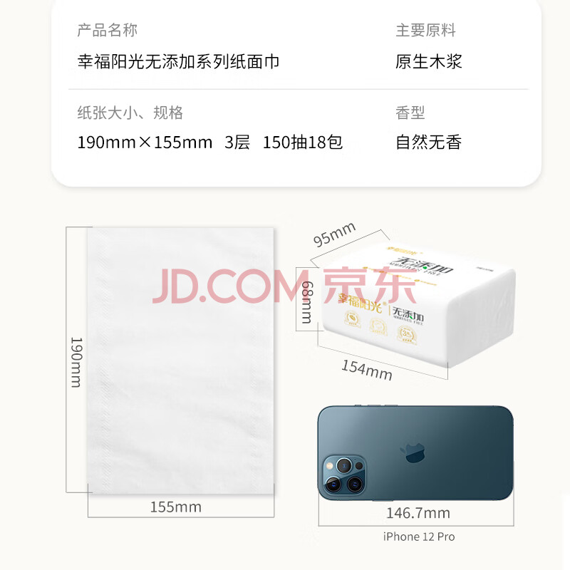 商品相册:幸福阳光抽纸 无添加系列 3层150抽*18包 加大加厚餐巾面巾擦手纸巾第