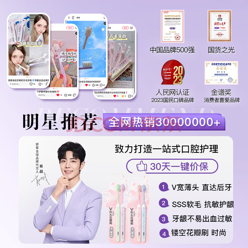 商品相册:舒客宽头樱巧牙刷2支装V型宽薄刷头超软毛护龈小刷头成人牙刷新老随机第
