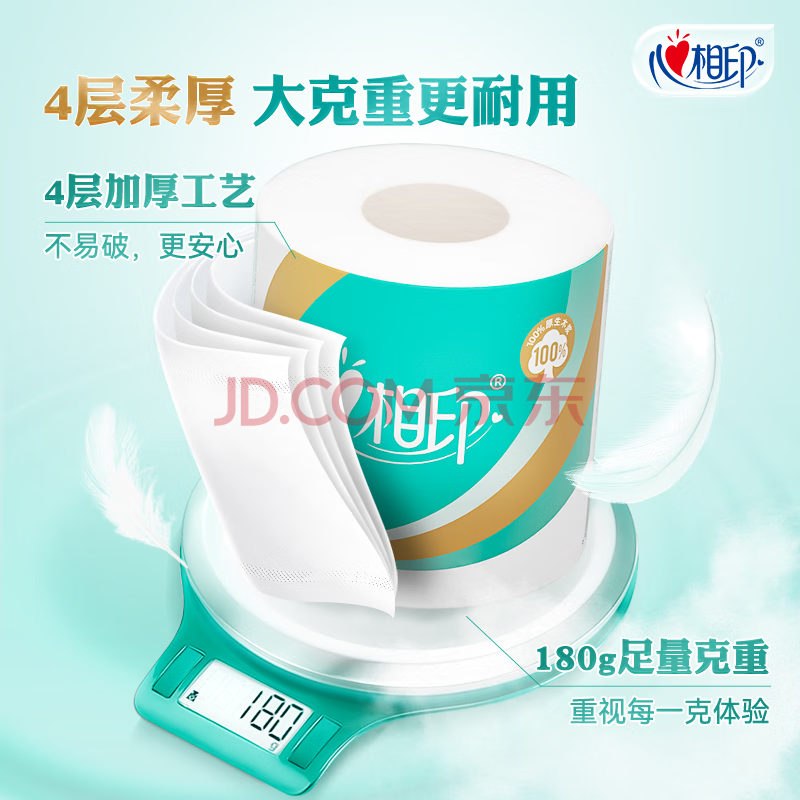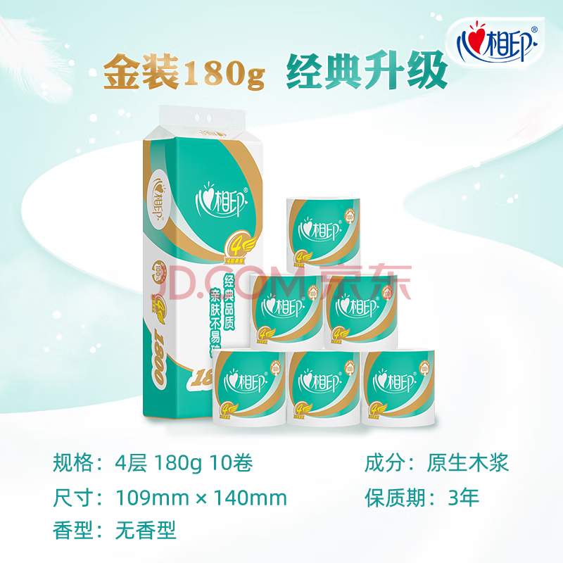 商品相册:心相印有芯卷纸 卷筒纸心柔4层180g*10卷卫生纸巾 大克重耐用 纸巾 提装第