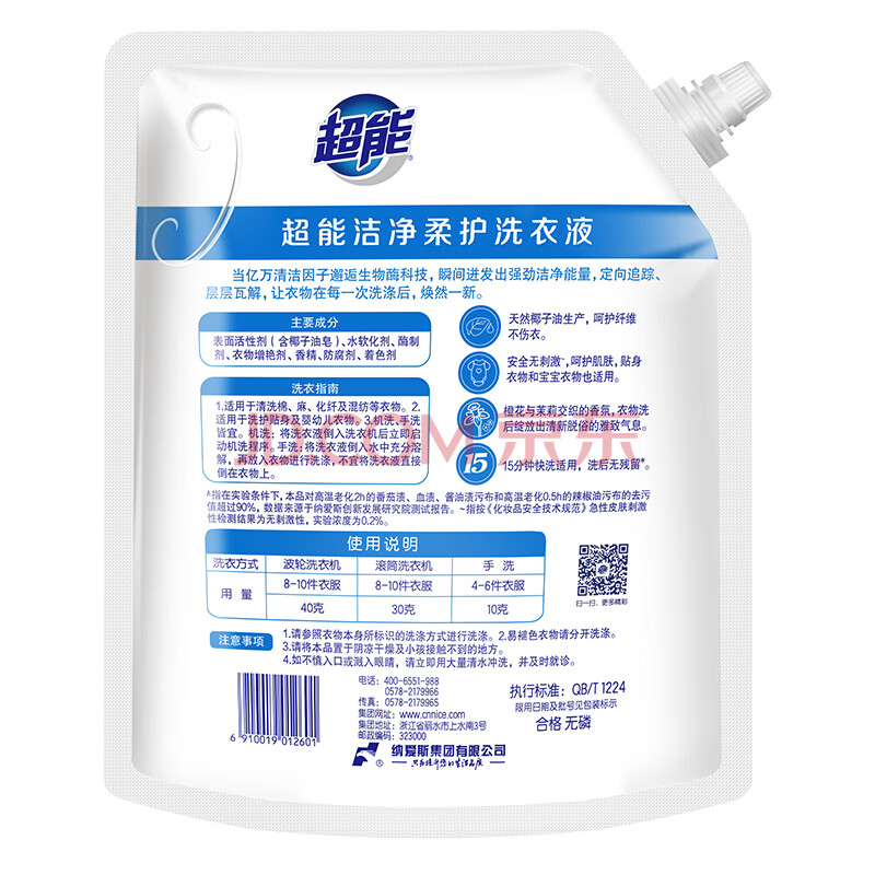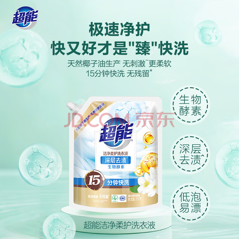 商品相册:超能 洁净柔护(鲜艳亮丽)洗衣液 自然清香 2kg*1袋 温和不刺激第