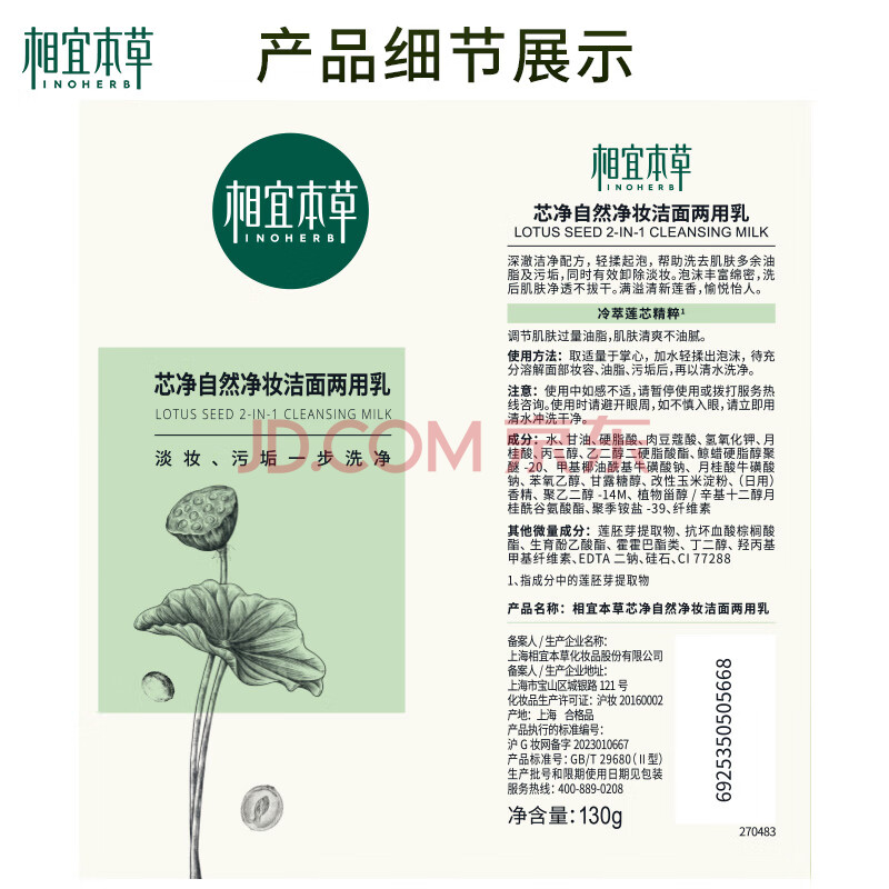 商品相册:相宜本草芯净自然净妆洁面两用乳130g 卸妆洗面奶第