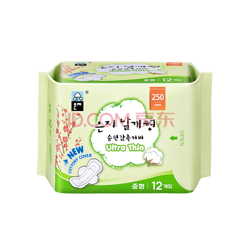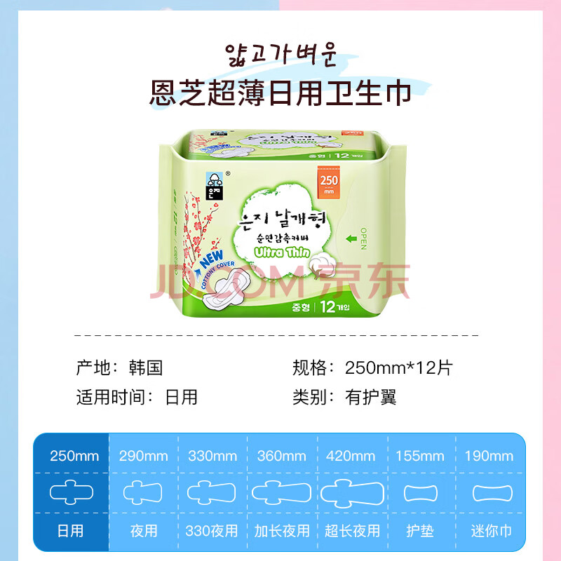 商品相册:恩芝(Eunjee)韩国进口日用卫生巾250mm12片 超薄舒爽透气轻盈护翼型少女姨妈巾第