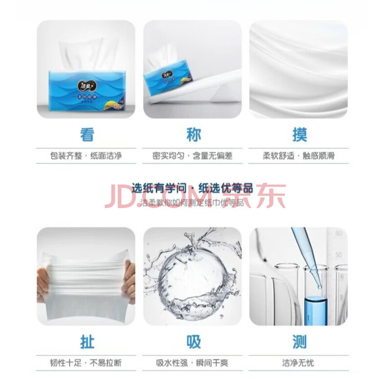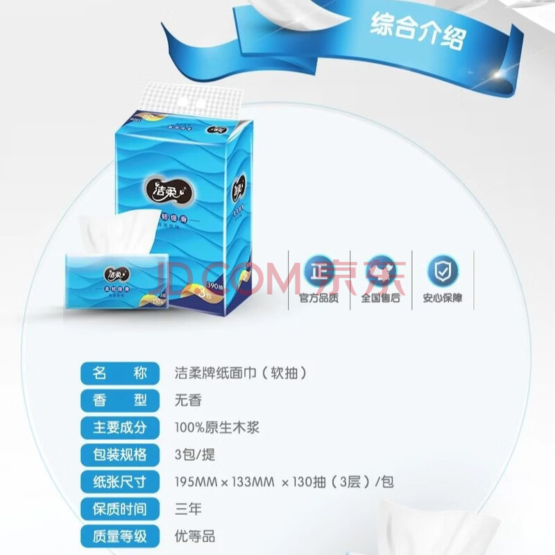 商品相册:洁柔抽纸 柔厚3层130抽*3包 蓝色丝柔尊贵 面巾纸 100%原生木浆第