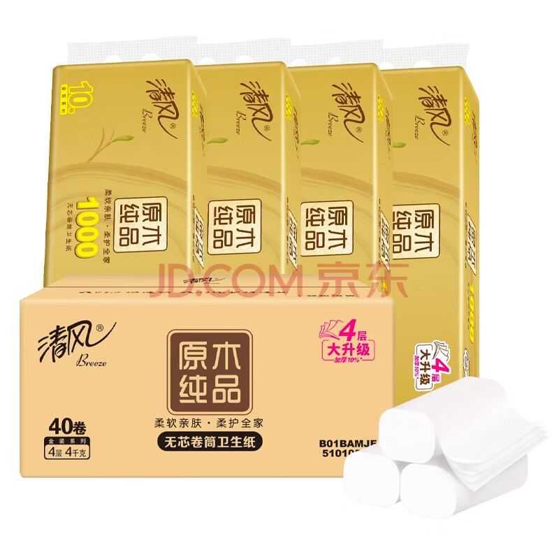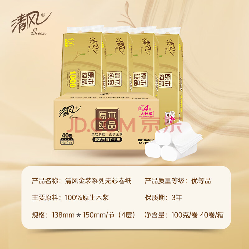 商品相册:清风无芯卷纸 原木金装 4层100克*40卷 卫生纸卷纸纸巾整箱 m码厕纸第