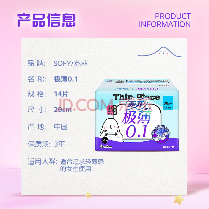 商品相册:苏菲极薄0.1量大日夜用卫生巾290mm14片 无感加长姨妈巾自营官方旗舰第