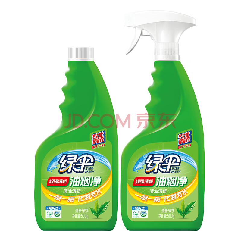 商品相册:绿伞超强清新油烟净厨房重油污清洁剂油烟机除油垢绿茶香型500g*2瓶第