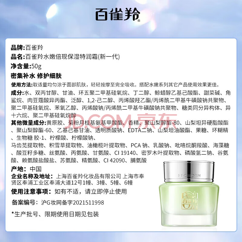商品相册:百雀羚护肤保湿霜水嫩倍现特润霜50g 补水保湿品质国货生日礼物第