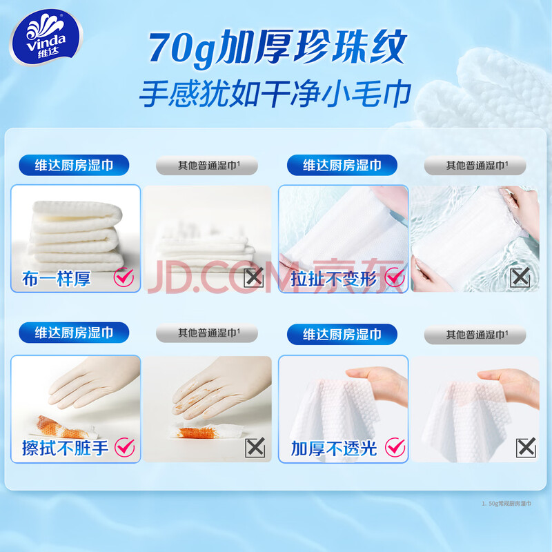 商品相册:维达(Vinda)厨房湿巾 60片单包 70克高克重厨房用强效去油污 加大加厚第