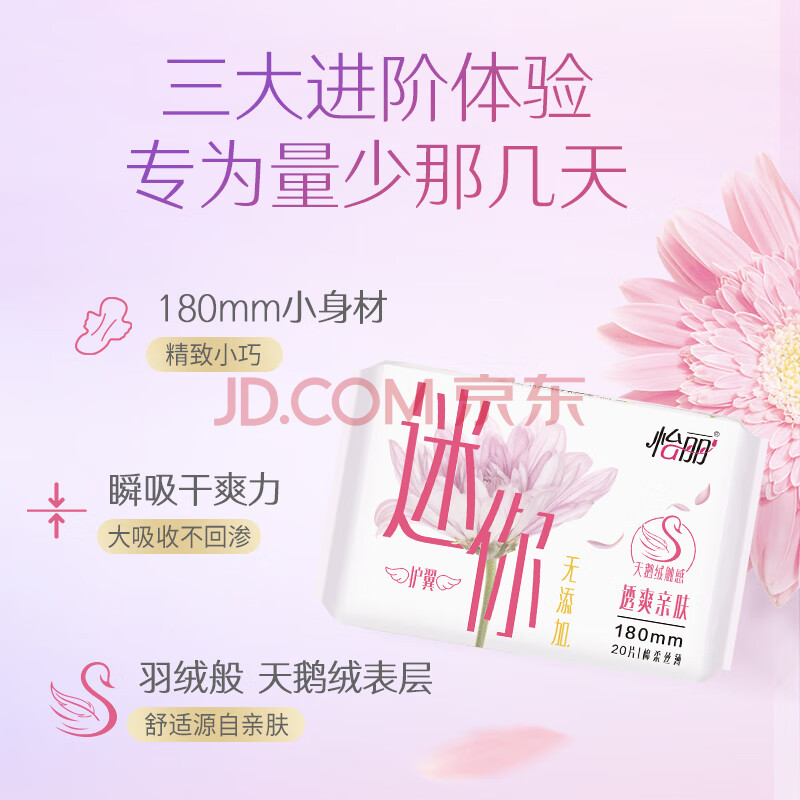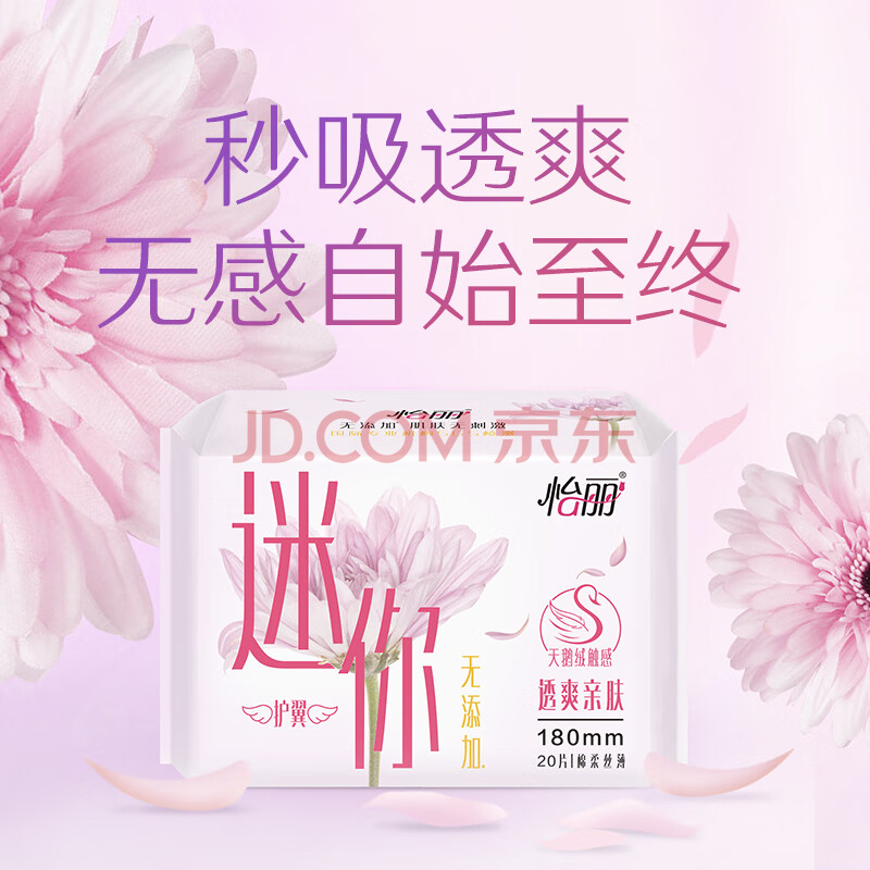 商品相册:怡丽迷你卫生巾超薄透气无感带护翼量少日用护垫180mm20片京东自营第