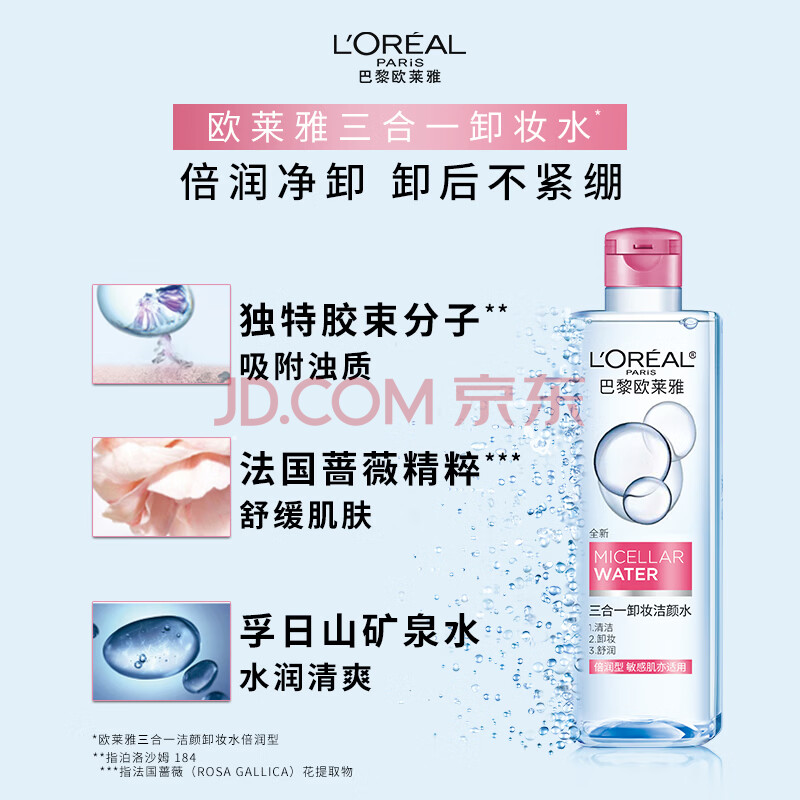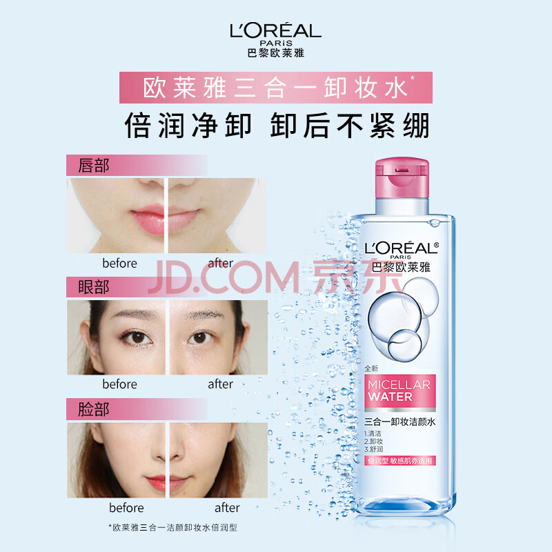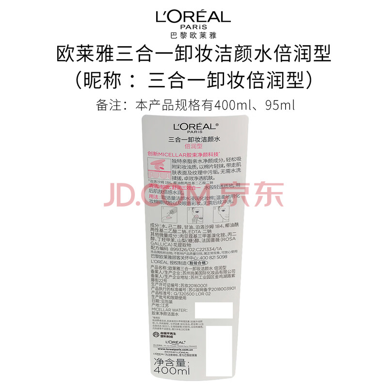 商品相册:欧莱雅三合一卸妆洁颜水倍润型400ml面部温和清洁护肤品生日礼物第