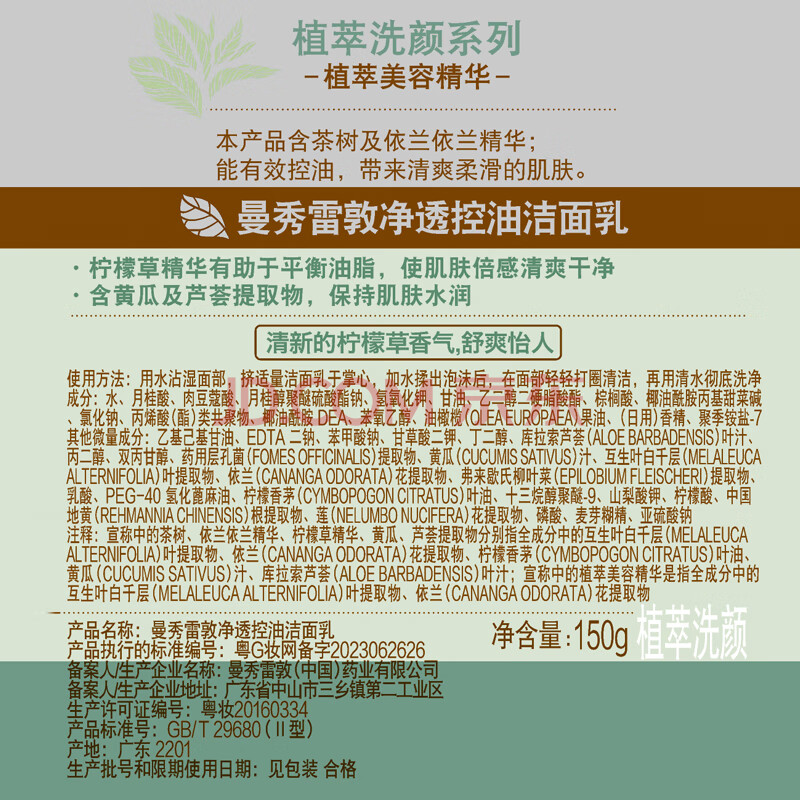 商品相册:曼秀雷敦洗面奶 净透控油洁面乳150g 细致毛孔温和清洁抑制黑头男女士第
