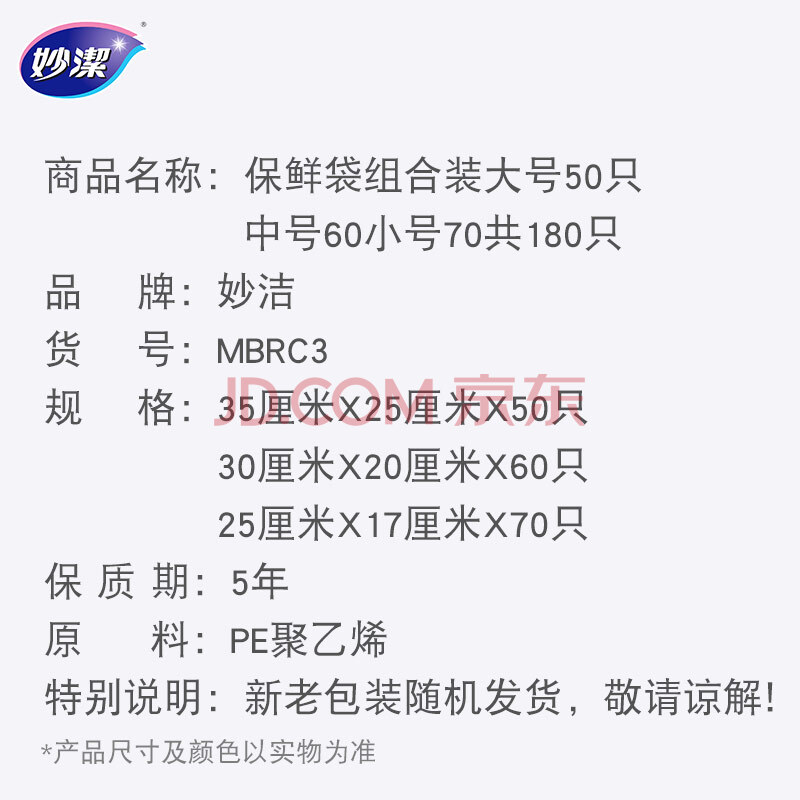 商品相册:妙洁保鲜袋组合装大号50只中号60小号70共180只 点断式食品袋子第