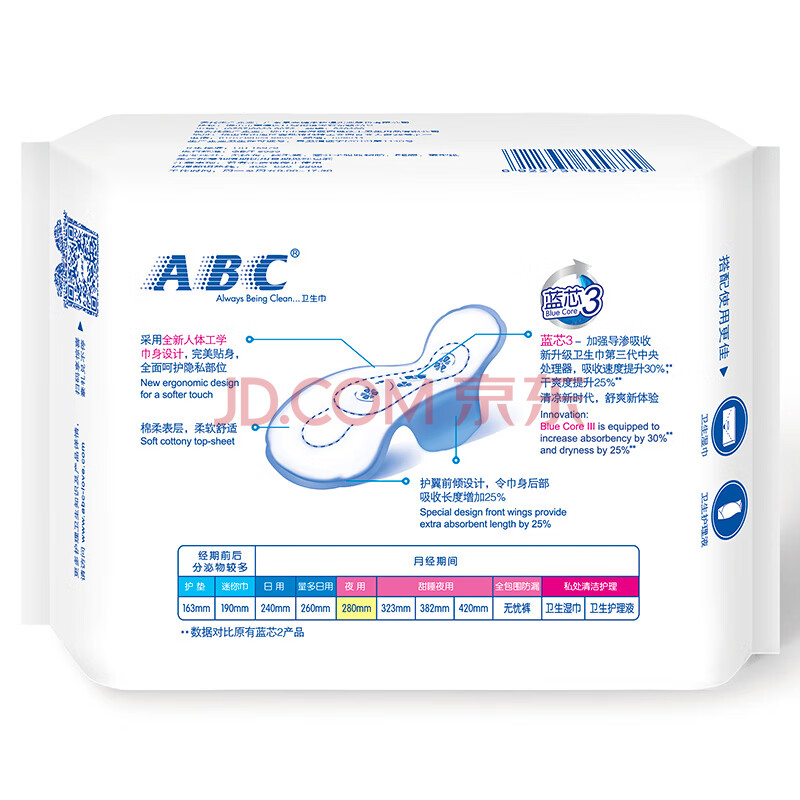 商品相册:ABCKMS纤薄健康配方超薄透气夜用卫生巾京东自营280mm*8片第