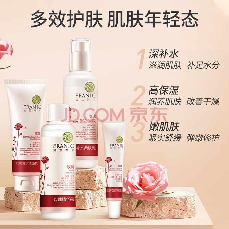 商品相册:法兰琳卡护肤品套装护肤礼盒玫瑰粉嫩补水保湿舒缓水乳4件套生日礼物女士第