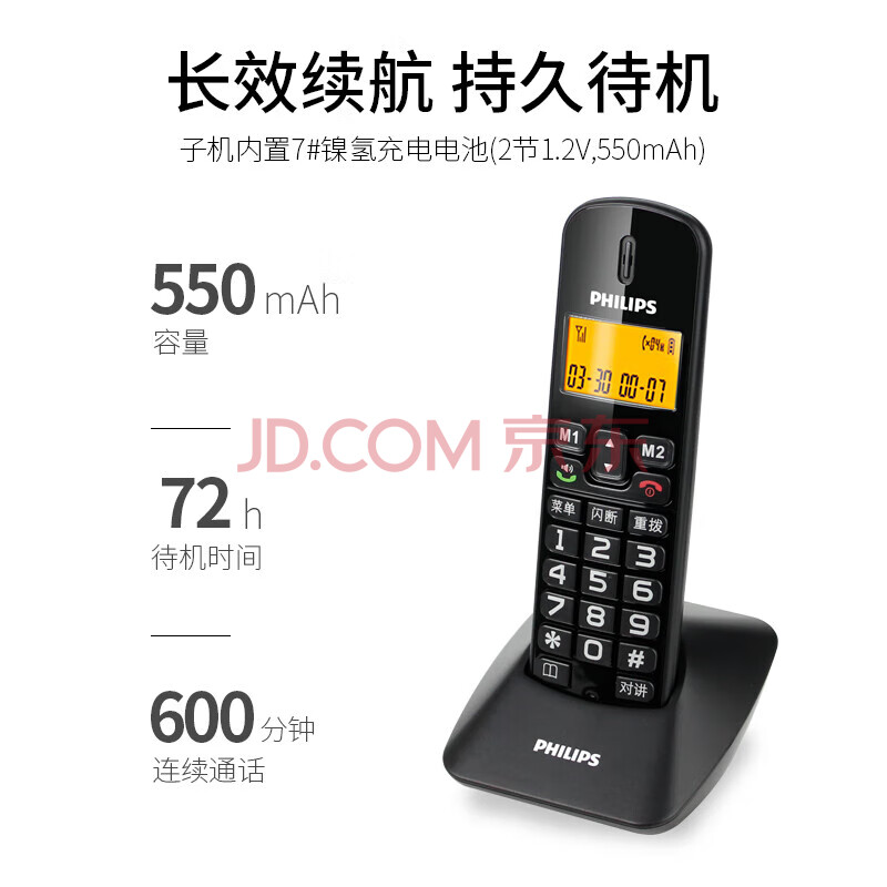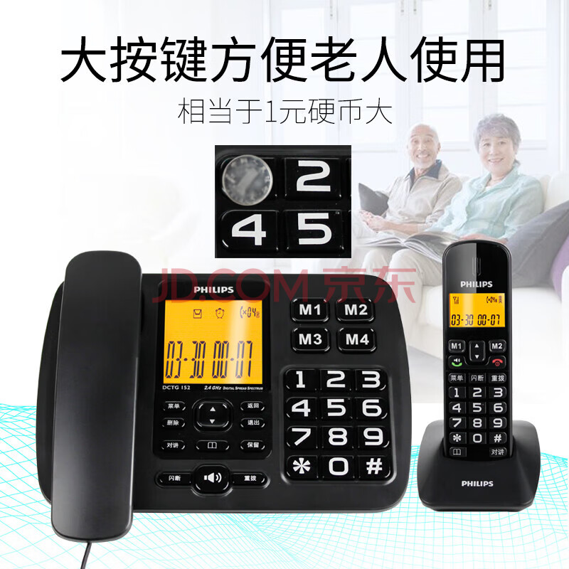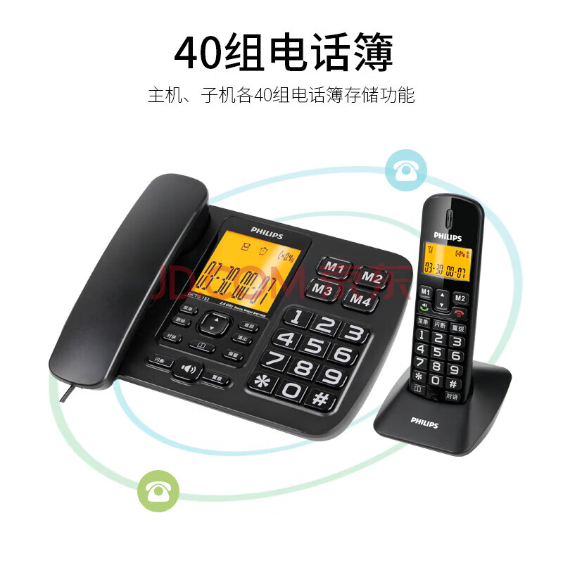 商品相册:飞利浦(PHILIPS)无绳电话机 无线座机 子母机 办公家用 一键拨号 内部对讲DCTG152一拖一 (黑色)第