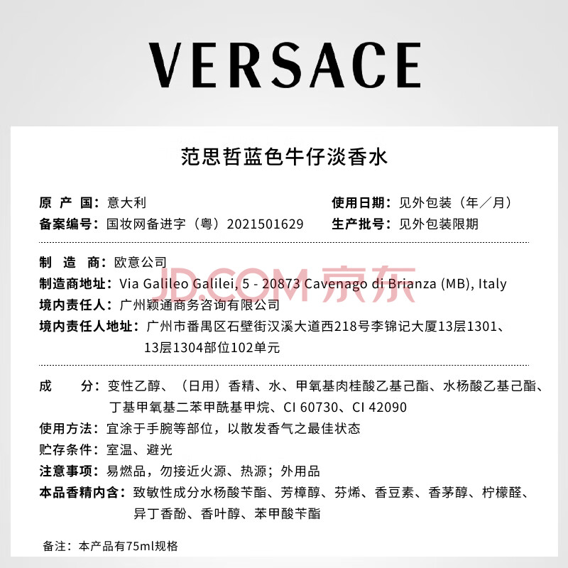 商品相册:范思哲(VERSACE)蓝色牛仔淡香水75ml 持久留香送男友男士生日礼物 可乐男士淡香水第