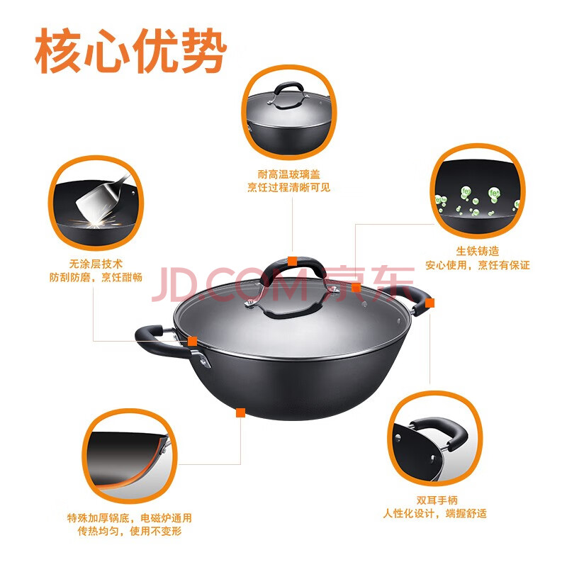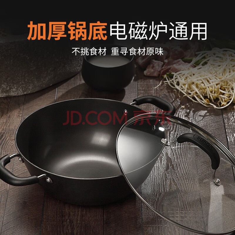 商品相册:苏泊尔supor 铸铁双耳无涂层深型炒锅34CM耐磨铁锅燃气电磁炉通用FC34Y1第