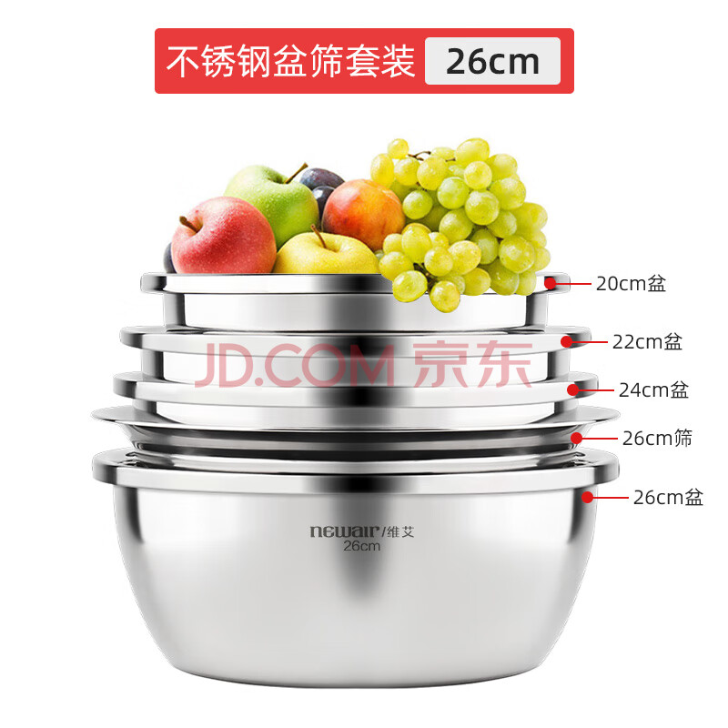 商品相册:维艾(Newair)不锈钢盆五件套调料盆淘米洗菜盆和面盆沥水篮沙拉盆米筛味斗套装第
