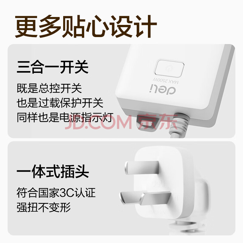 商品相册:得力(deli)3C认证国标安全插座 插排/插线板/接线板/排插/拖线板 总控开关 儿童保护门 6位3米 白色 18256第