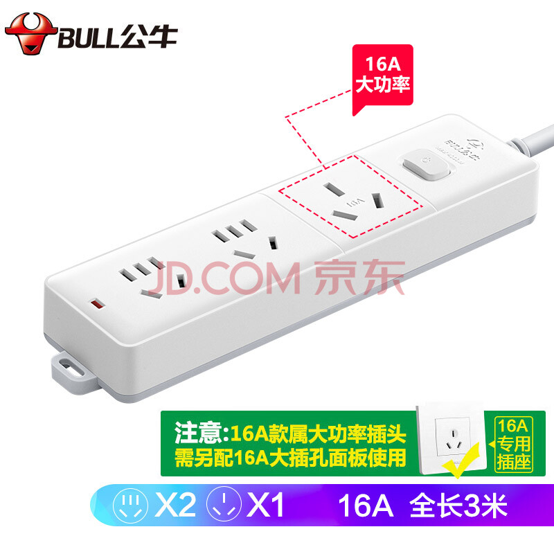 商品相册:公牛(BULL)大功率16A插座16a排插/插排/插线板接线板 适用空调/热水器/电暖气 3位总控全长3米送10A头GN-406D第