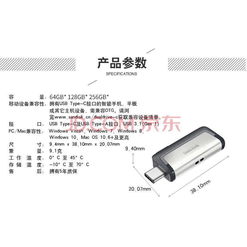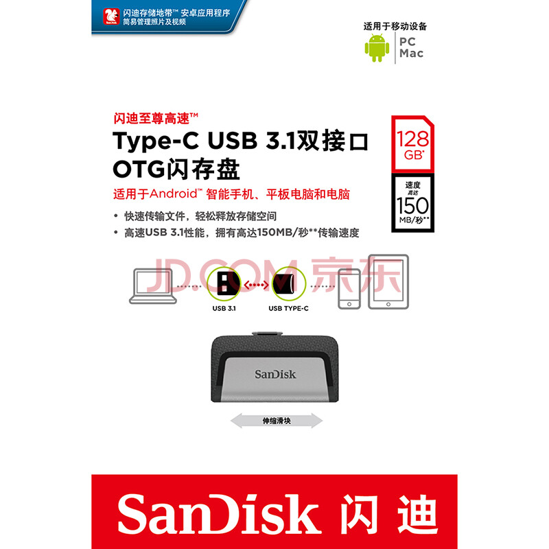 商品相册:闪迪(SanDisk)128GB Type-C USB3.1 手机电脑U盘DDC2 读速150MB/s 便携双接口 安全保密 智能APP管理第