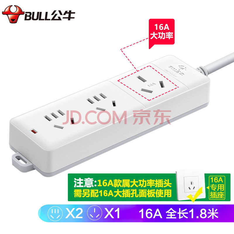 商品相册:公牛(BULL)大功率16A插座16a排插/插排/插线板接线板 适用空调热水器电暖气 3位无开关全长1.8米送10A头405D第