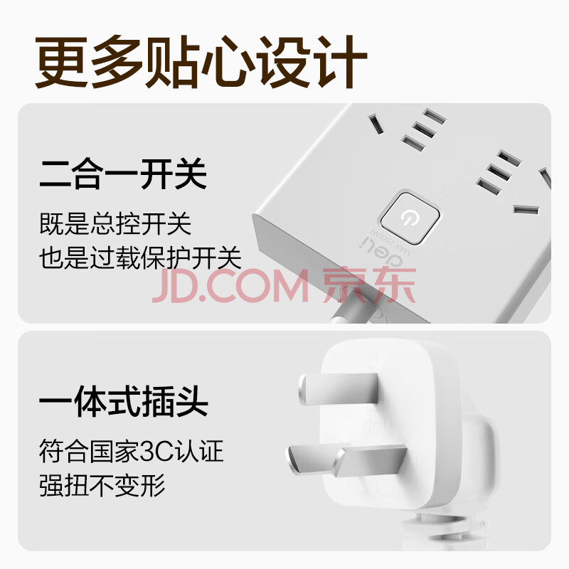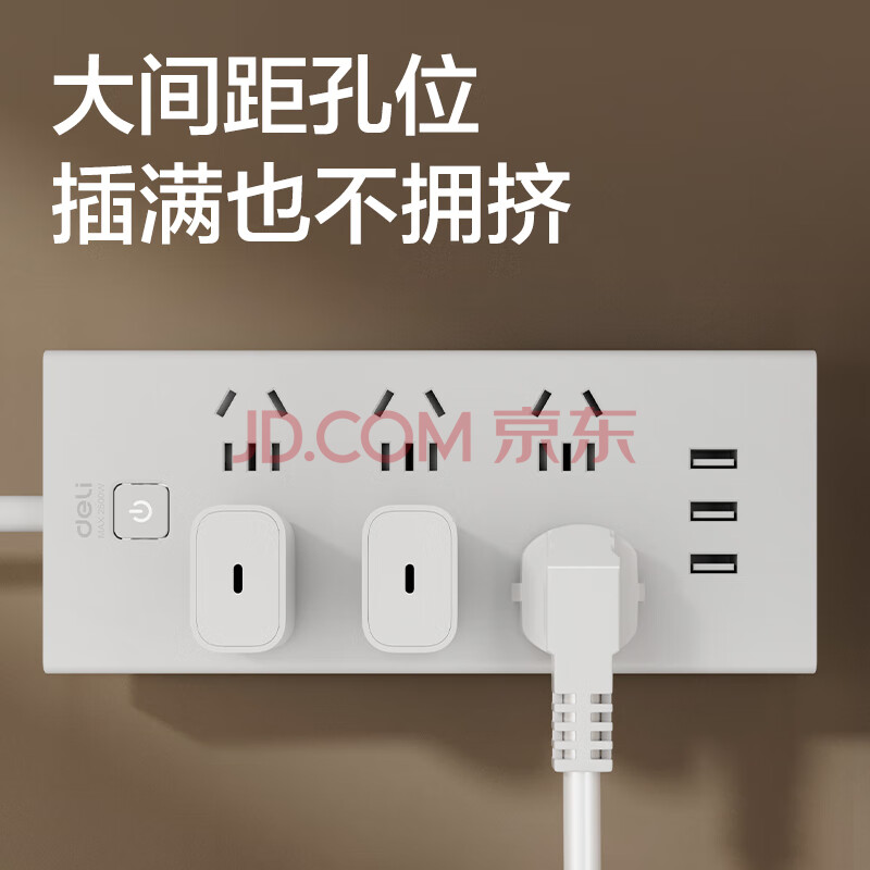 商品相册:得力(deli)USB智能插座 插排/插线板/接线板/排插/拖线板 3USB接口+6孔 总控2米 儿童保护门 27080第