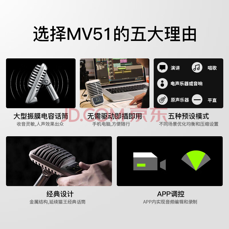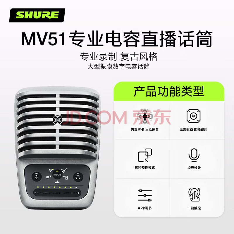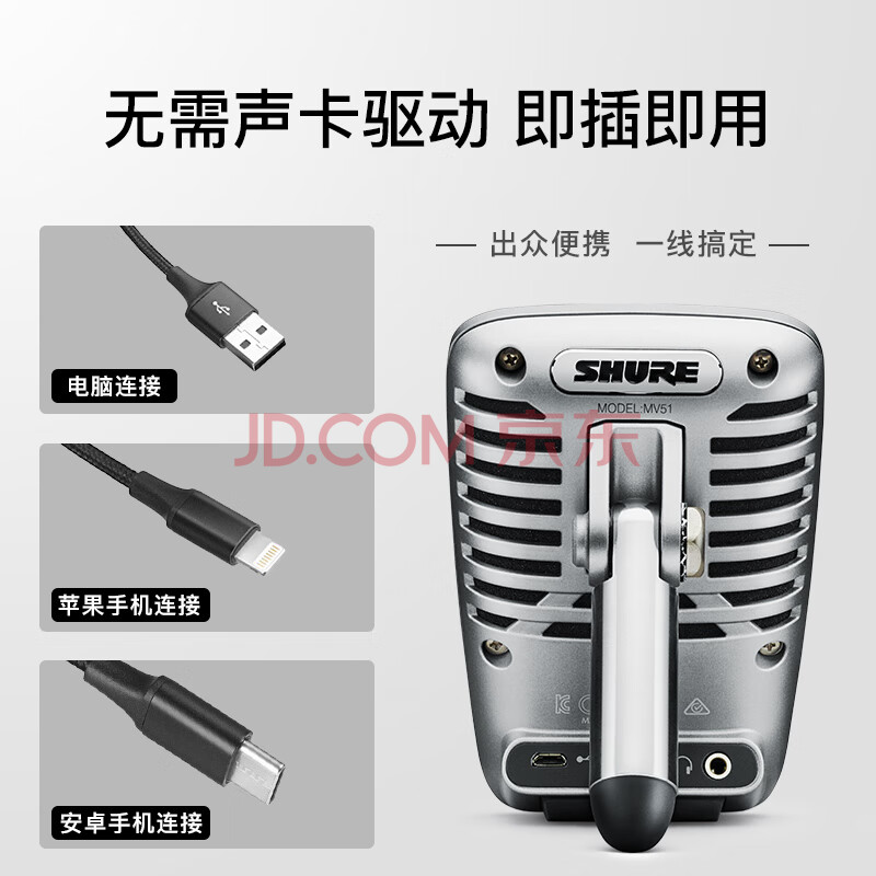 商品相册:SHURE舒尔MV51大型振膜电容麦克风 电台录音视频制作可返听有声小说直播唱歌录制会议麦克风话筒第1张/共8