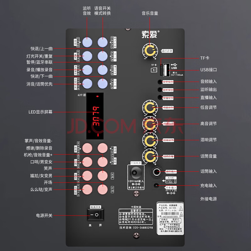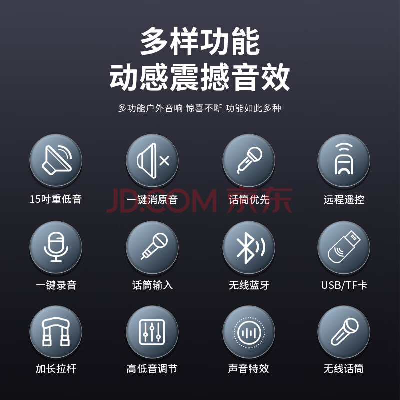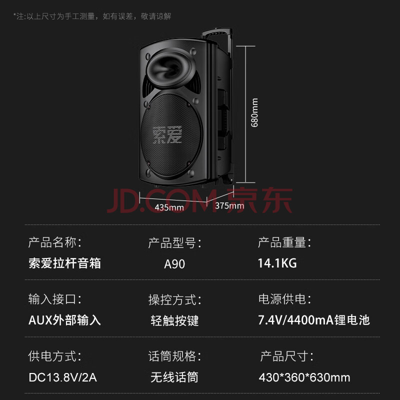 商品相册:索爱(soaiy)15吋广场舞音响大功率便携式户外重低音蓝牙k歌大音量移动拉杆音箱室外演出设备双话筒A90第