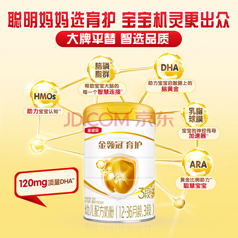 商品相册:伊利金领冠育护幼儿配方奶粉3段12-36个月960g*1罐【5倍DHA好脑力】第
